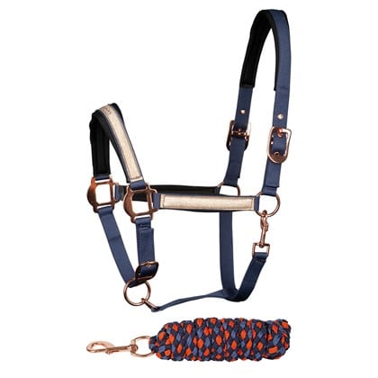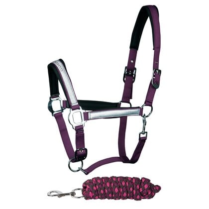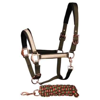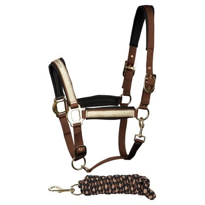 Halsterset met glitter band op de neus- en kaakband en een print op de neusband, neopreen onderlegd op hoofd- neus- en kaakband, verstelbaar bij neus- en kopstuk en metalen gespen.