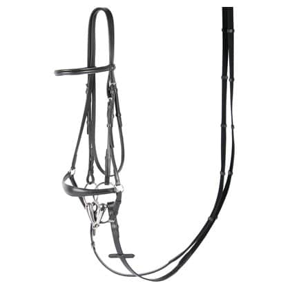 Leder hoofdstel met een lage neusriem, ideaal voor het africhten van paarden. Padding onder neusriem en kopstuk. RVS gespen. Inclusief webbandteugel met stops.