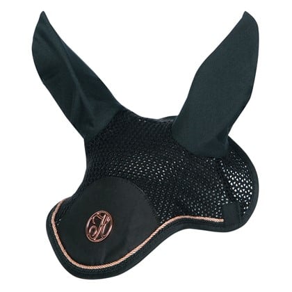 Oornetje met elastische oren. Gehaakt, voorzien van gevlochten sierkoorden en contrasterende bies. Door de rosegouden kleurige badge een ware eyecatcher!